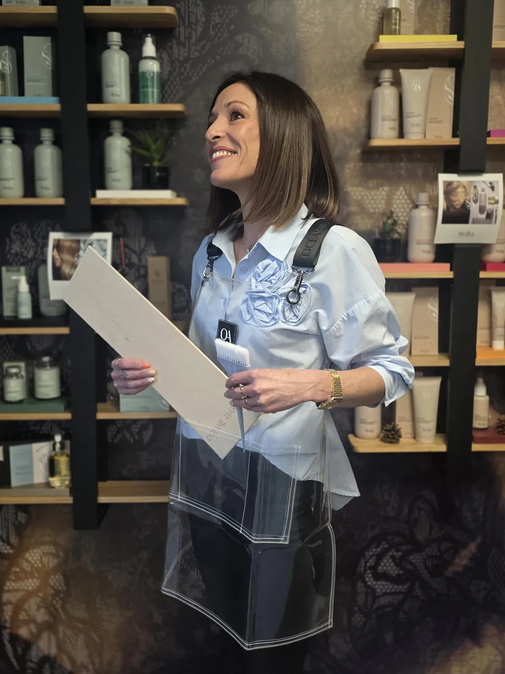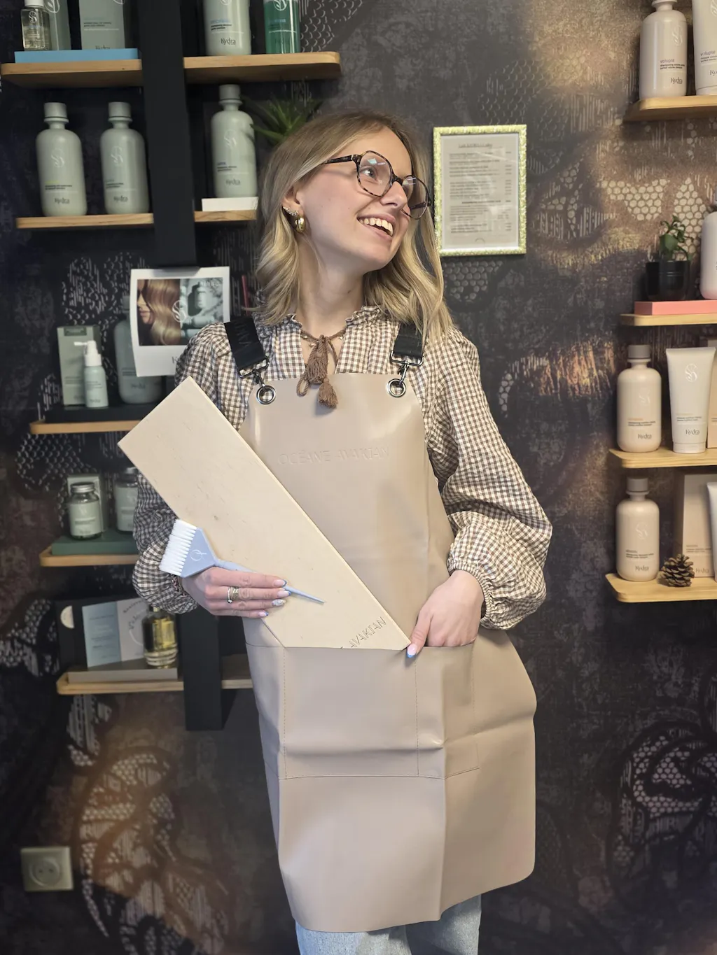 Matériaux de qualité : Fabriqués à partir de PVC durable (pour le tablier transparent) et de cuir vegan (pour le tablier beige), ils sont tous deux résistants aux produits chimiques, tout en restant souples et agréables à porter pendant de longues heures de travail.